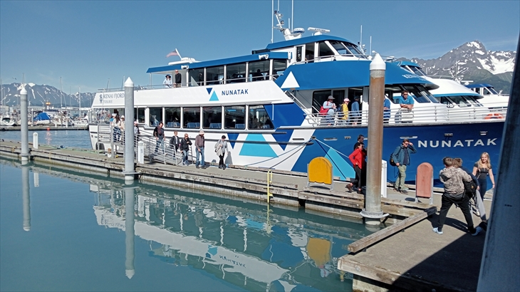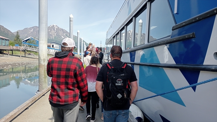 12時30分から開催される遊覧観光の正式な名所は「スワード発レザレクションベイ半日&野生動物ツアー」です。集合場所に12時ころ行くと既に大行列。12時10分ころ乗船開始、たくさんの観光客だったので遊覧観光は2隻の船で実施です。我々は後半の船に乗り込みました。