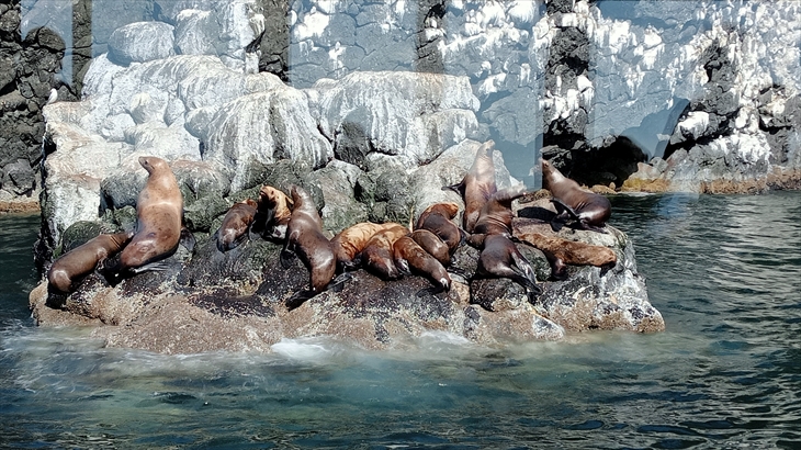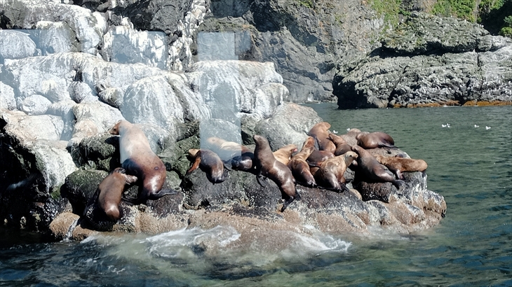 15時30分、海鳥がたくさん飛んでいる場所で、アザラシが休んでいる所を見学。岩はアザラシで満杯です。