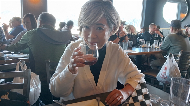 2階席と風を感じることができるアウトドア席が人気のようですが、我々は1階席に座り、冷えた缶ビールで乾杯です。これから4時間30分の遊覧観光が始まります。