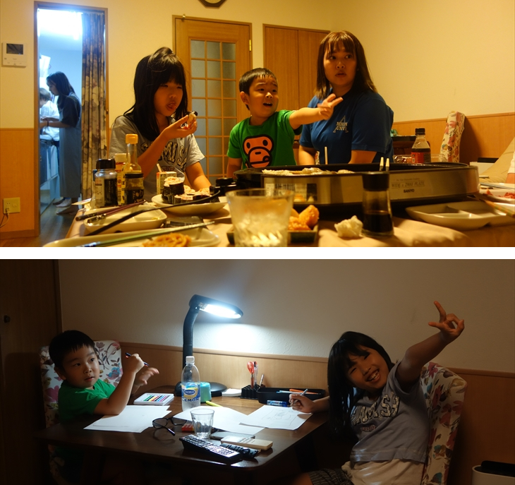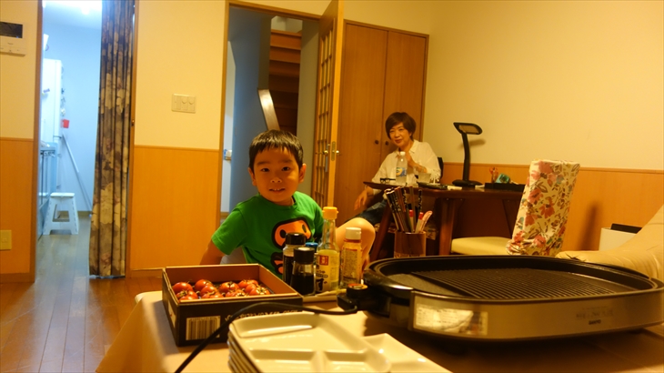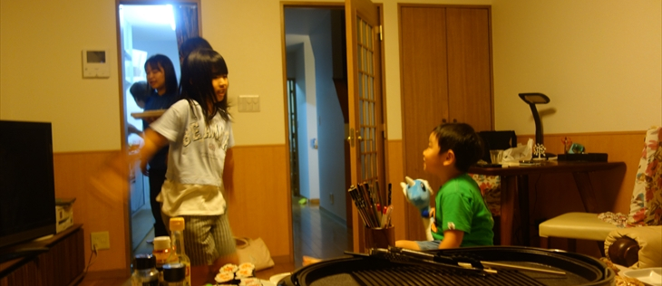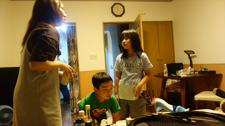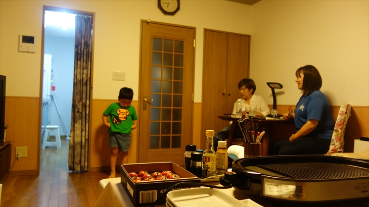 テーブルセッティングを行い、ホットプレートを設置して準備完了。18時25分に東白楽に到着という連絡があり新しい車で利太朗くん達をお迎えしました。アヤちゃんはお昼寝したらしく、少しおくれて19時ころに全員集合しました。