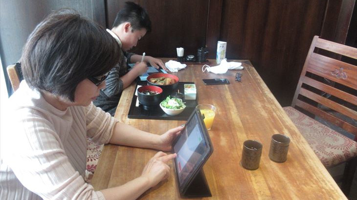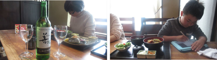 唎き酒後、ぽんしゅ館1階にあるレストランでお昼ごはんにすることにしました。椅子が大きくゆったりとできるテーブル席に案内され、タッチパネルで注文する方式です。