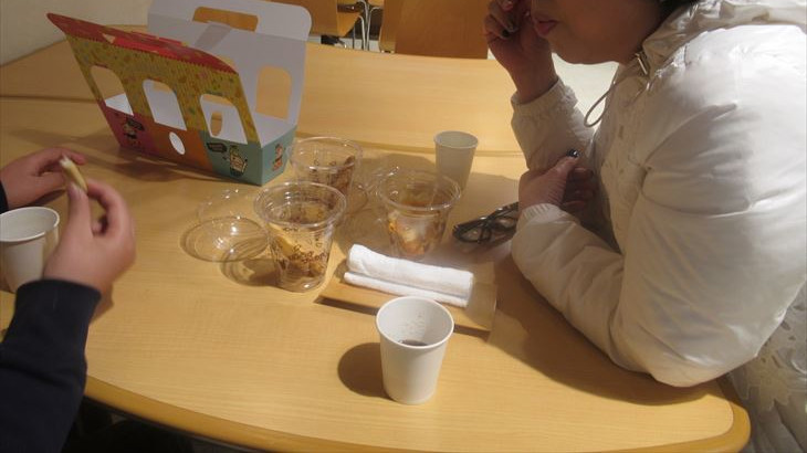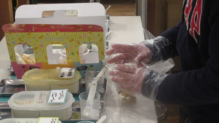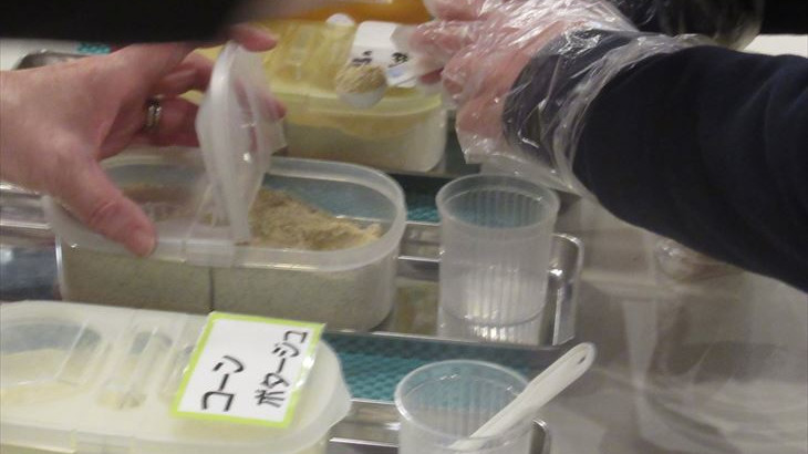 駐車場には車が一台もなく、お休みかと思いましたが、我々が一番乗りでした。体験館に入り、お煎餅に味付けする体験を行うことにしました。12枚のお煎餅を3つのカップに分け、3種類の味パウダーを選び、投入してシャカシャカで出来上がり。