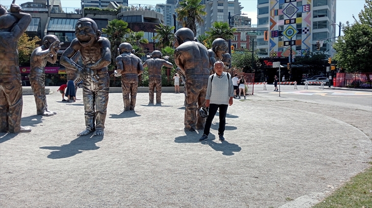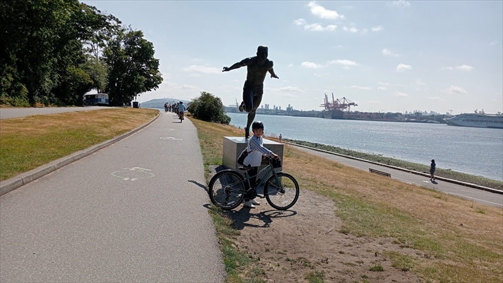 イングリッシュベイはバンクーバーで人気の海水浴場で管理が行き届いて綺麗です。ここで相方を待ってましたがいつまで経っても現れません。心配になり、一方通行付近まで引き返したところ合流できて一安心です。休憩時の再出発の合図に気付かなかったそうです。イングリッシュベイでもう一度休憩です。謎の銅像群(A-maze-ing Laughter)と記念撮影。ホットドックはソースが独特で美味しかった。