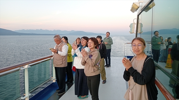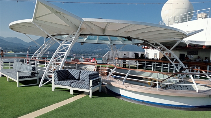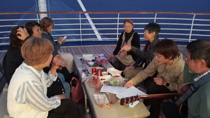 12階船尾デッキで開催されているチャット仲間の出航宴会に参加しました。バンクーバーの行動や今までの思い出を語り合い、夕日を観てギター伴奏で歌い、宴会は22時頃まで続きました。