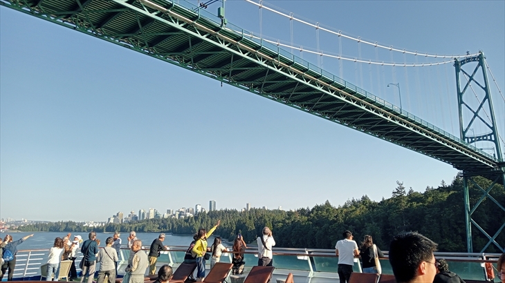 18時頃、部屋で船が動くのを感じたので14階船尾に行きました。若者たちも集まり、出航の歌が流れバンクーバーの余韻を楽しんでいます。出航式はライオンズ・ゲート・ブリッジの下を通過する辺りまで続きました。