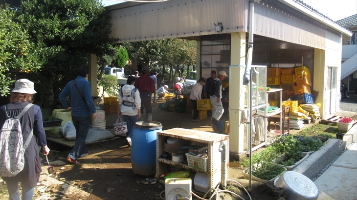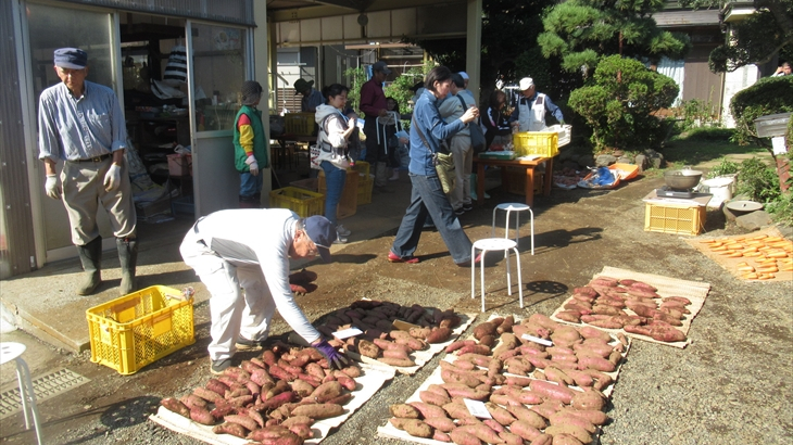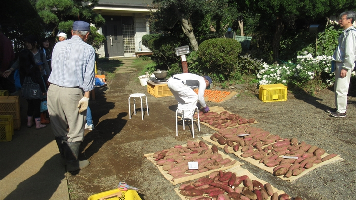 神大寺地区センターから住宅街を5分ほど抜けるとMKファームの作業場。午前中に掘ったサツマイモをシートに広げ天日干しをしているところでした。