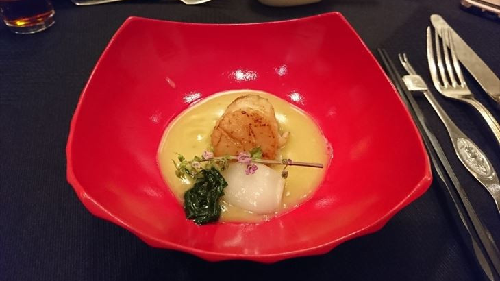 18時20分、マカオ発祥ポルトガルソースの帆立貝柱のオーブン焼きと花巻パン添え伊勢エビの四川チリソースが登場・・・
