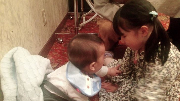 お食事済んだ利太郎くんは床に座りお遊びタイム、文ちゃん達が駆け付け一緒に遊びます。