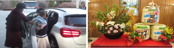 お正月の振る舞い酒をいただきラウンジで少しゆっくりして17時に予約している夕食会場へ向かいました。