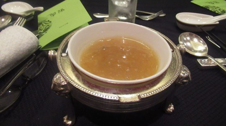 18時ころ、上海蟹味噌の旨味のフカヒレスープと旨味のある乳猪醤とクレープに包んだ北京ダックが登場・・・