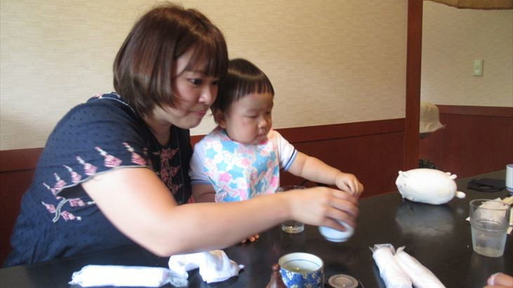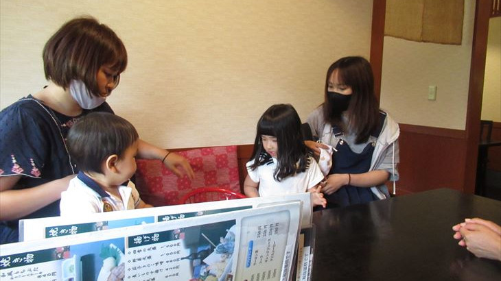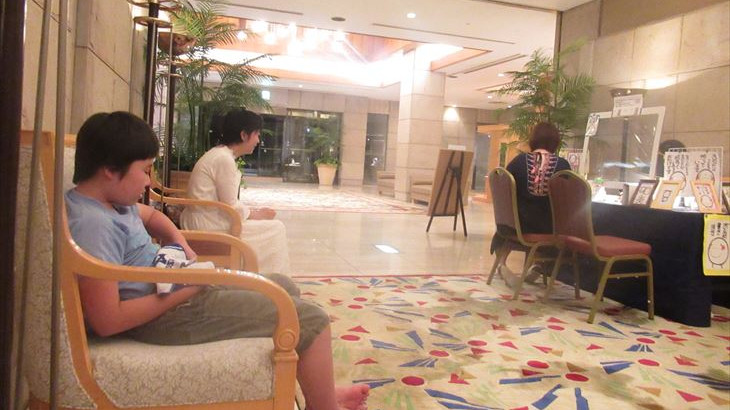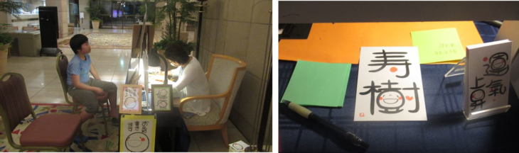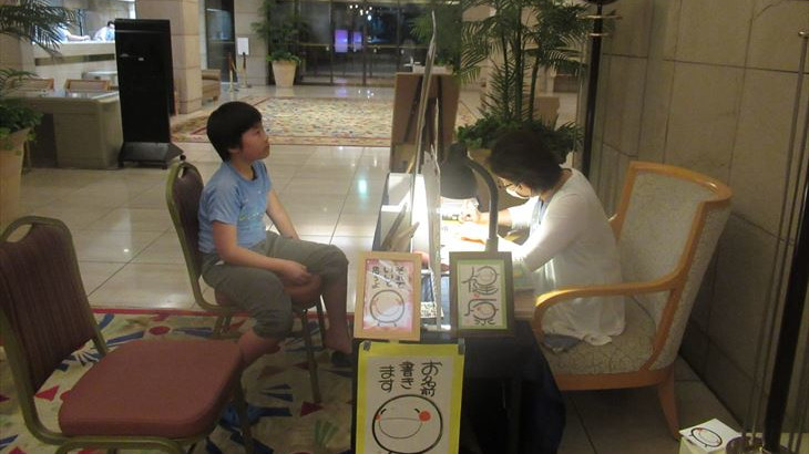 ゲームセンターを終え、お部屋に戻る途中、ロビーのエントランスに特殊文字で名前を書いてくれるコーナで利太郎くんと寿樹くんのお名前を書いてもらいました。書いているところを見学しながら出来上がった色紙は思い出になるでしょう。