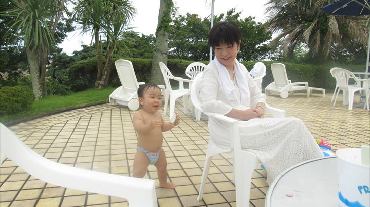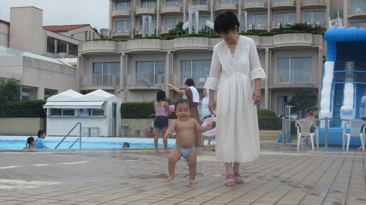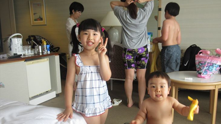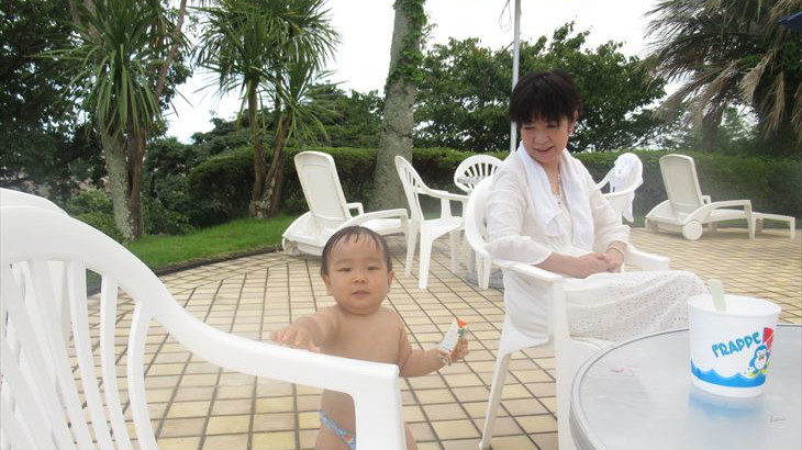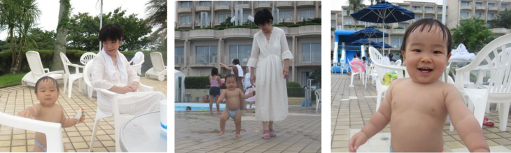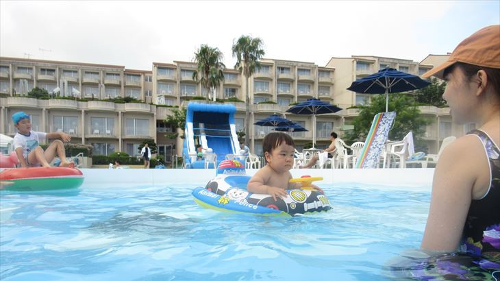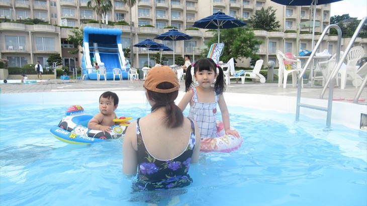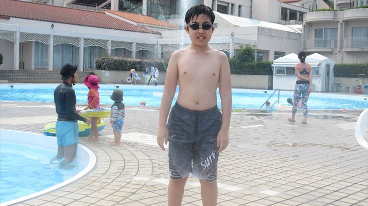 14時少し前でしたがチェックイン。お部屋で水着に着替え、プールで遊び始めたのは14:45。お天気は少し曇りぎみ、いつもならプールサイドは裸足では歩けないくらいに熱い、今日は平気。来週からプール使用は予約制、今日は平気、でも人はまばら。