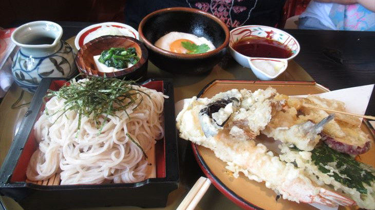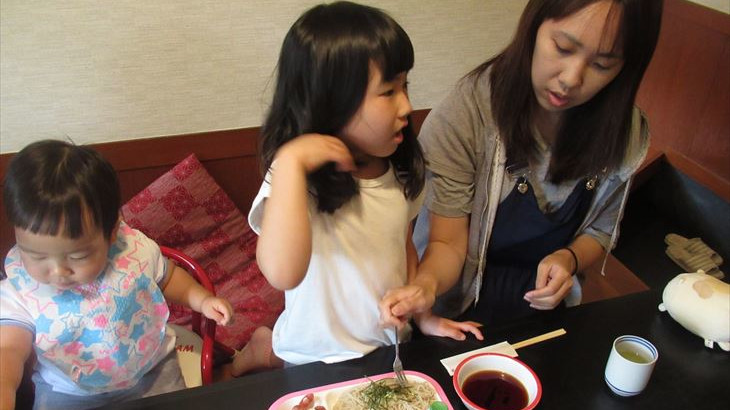長女は天ざる蕎麦、次女はとろろ天ざる蕎麦、私は三味蕎麦、妻は恒例の大盛せいろ蕎麦と蕎麦焼酎割を2杯、蕎麦がきも注文。トシ(小6年)は冷やしたぬき蕎麦、アヤちゃん(5歳)はお子様蕎麦、利太郎くん(1歳)はお子様うどん。
