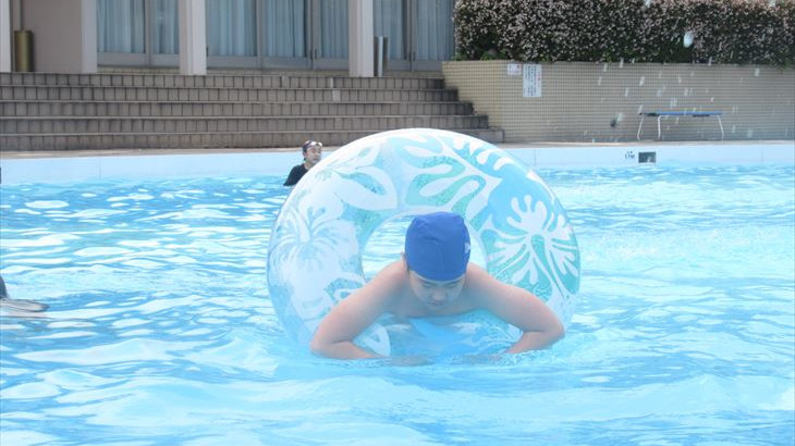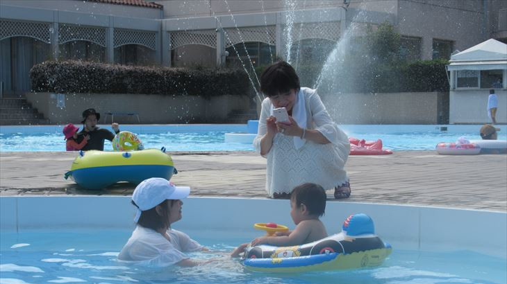 利太郎くんはパトカーの浮袋でプカプカ、トシ(6年生)は大人の大きな浮袋、アヤちゃん(5歳)は去年買ったアナ・雪の浮き輪。ママと一緒のプール、とても楽しそう。プールは入らないと言ってたトシもノリノリ。