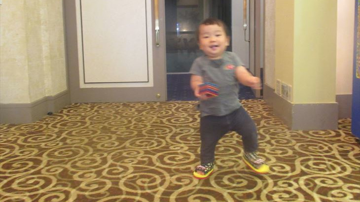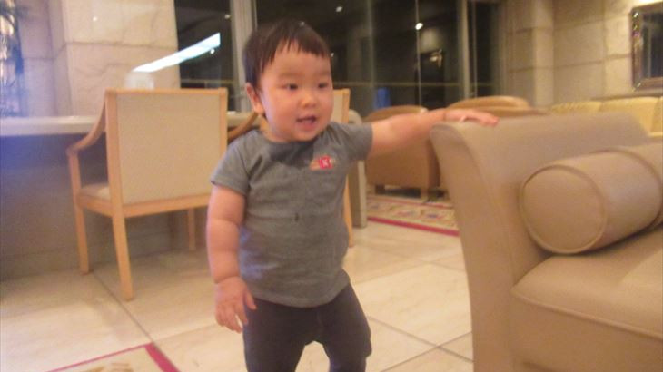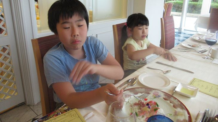 お風呂上りの利太郎くん、たくさん遊んで疲れて17時ころ寝てしましました。17:30からのディナー、2名は30分遅れです。子供達はワイングラスのようなグラスに入ったジュース、我々はフリードリンクの生ビール、長女はジンジャエールで乾杯、夕食が始まりました。