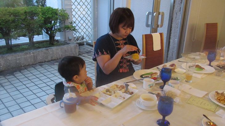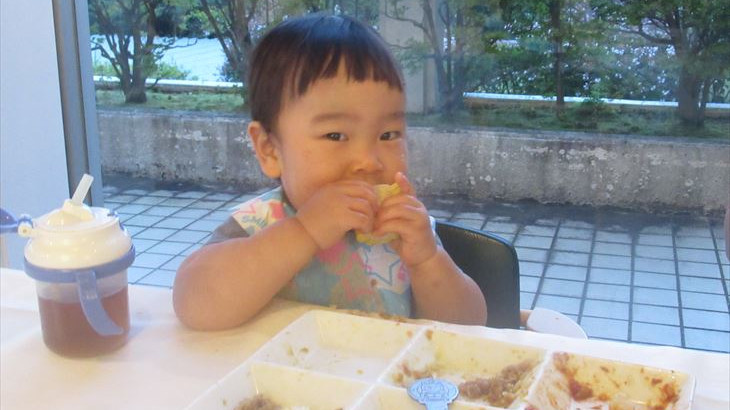 18時ころ2名が来ました。1歳の利太郎くんは1500円のワンプレートに8品揃えたお子様セット。たくさん寝たのでご機嫌、ほぼ完食、追加注文したトウモロコシを握りしめニコニコ。
