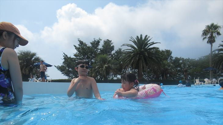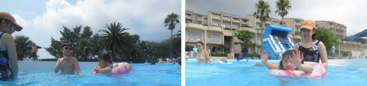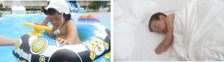 9時45分ころママや利太郎くんが合流。利太郎くんは大人用プールでプカプカ、10時23分ころプカプカしながら寝てしましました。