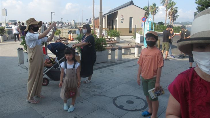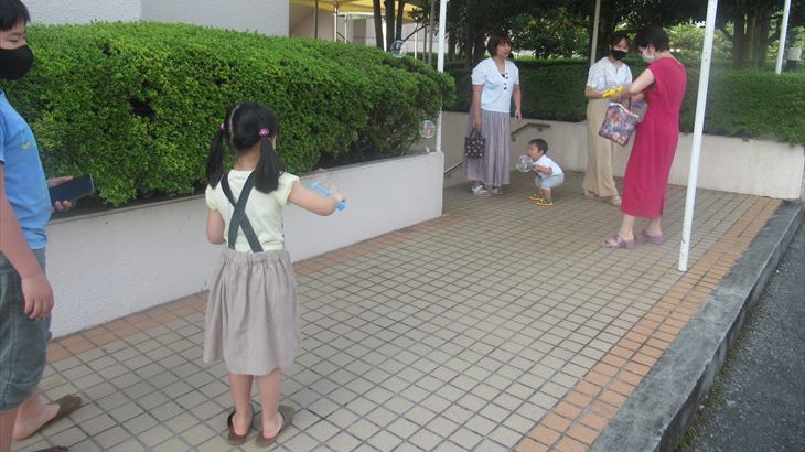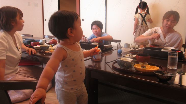 7時ころ、トシを連れてお風呂へ、皆がお風呂に入り朝ご飯へ向かう準備ができたのは8時頃。アヤちゃん待望のシャボン玉をホテル駐車場前の日影で少し行い、朝ごはん会場の黒潮に向かいました。