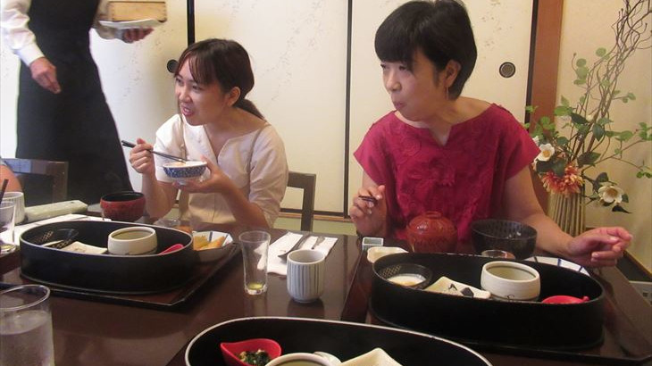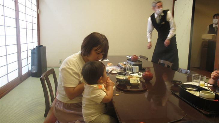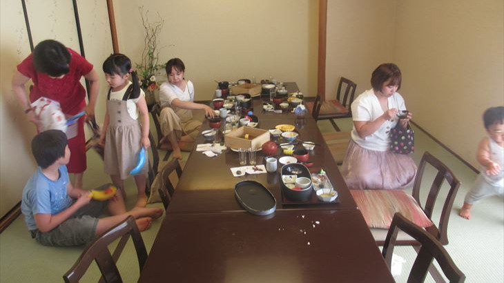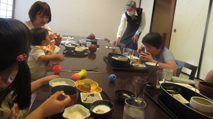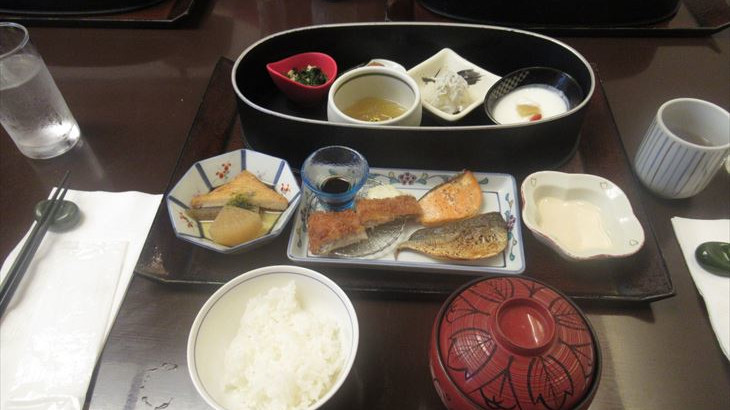 黒潮の朝ご飯も昨年まではバイキング形式でしたが、今年は従来の朝ご飯ご膳の提供になっていました。黒潮に到着したのは8時20分、テーブル席はほぼ満席、広い和室に案内されました。