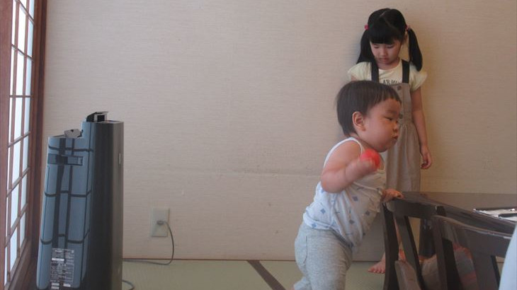 朝6時30分ころ隣の部屋へ行ってみると、アヤちゃんが一人起きていてチョコンと座っていました。トシも物音で起き、自主的に着替えと歯磨き。
