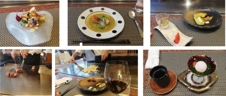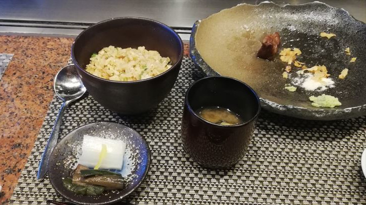 白ワインボトルを注文、サラダ・丁寧に鉄板で焼いたサワラとソース・ひげまで食べれるヤングコーンを含む季節野菜、噛むと脂が滴るお肉は絶品でした。〆は優しい味のガーリックチャーハンとトマトリゾット、デザートで約2時間の夕食は終わりました。