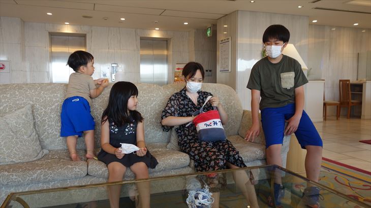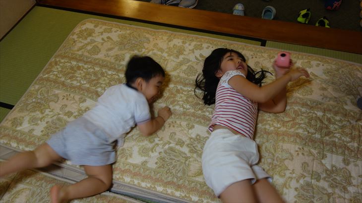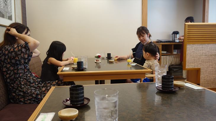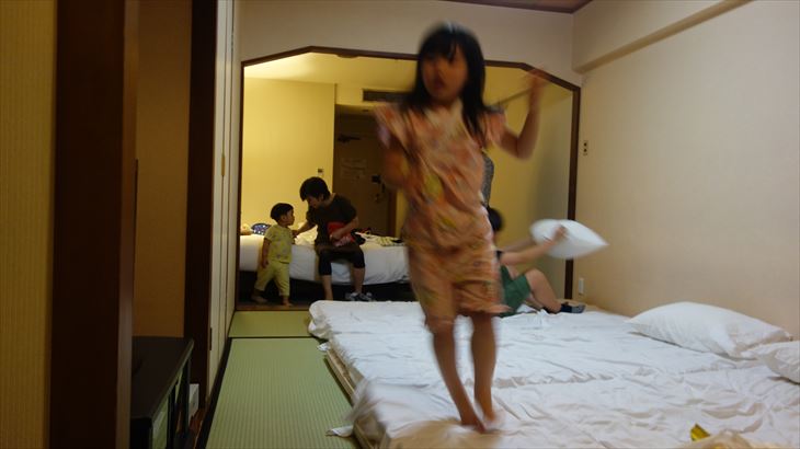 14時ころお部屋が利用できるようになったと同時にプールは終了。お部屋でゴロゴロしたり、温泉に入ったり、子供たちはお昼寝。そして、夕食は黒潮17時です。アラカルトで追加注文したかき揚げの天婦羅が美味しかった・・・