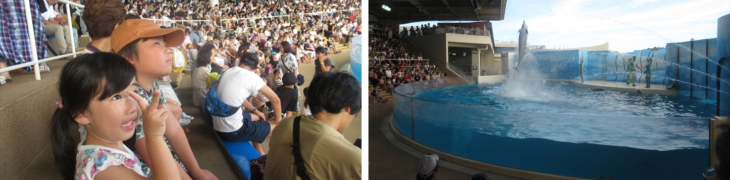 16時から開催されるイルカショーを目指して館内を歩いていたところ、途中でペンギンの餌やりショーを見学。連絡の行き違いで一瞬小学校5年生の孫が迷子に、イルカショーが開催されると迫力と演出に興味深々。