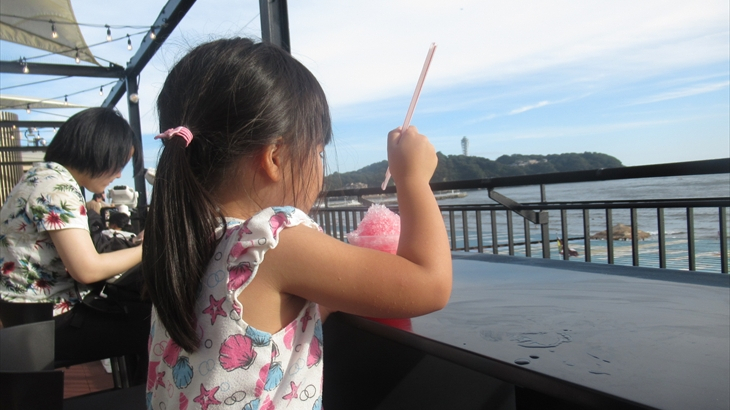 本館の大水槽のショーがはじまる前に、相模湾が一望できるテラス席でかき氷。小学校5年生の孫は新発売のタピオカ風ブルーハワイがイマイチだったのでテンション下がり気味。