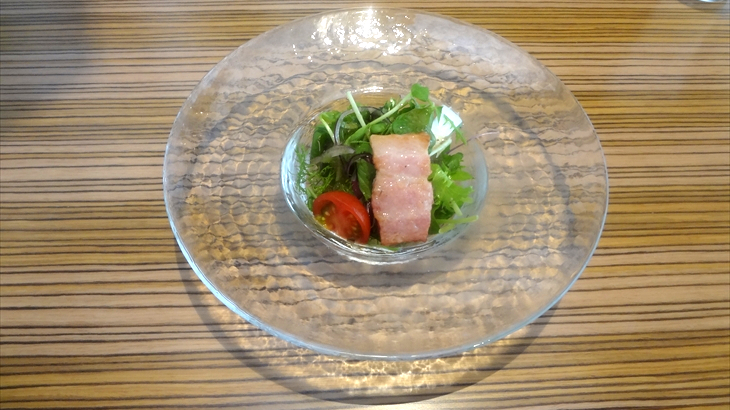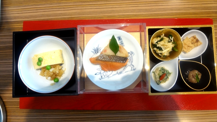 朝食は7時30分から10時までの営業時間。9時ころ伺い、数分待ってから敷地中央にある広い水庭を眺めることができる小上がりの席に案内されました。お客様は6割程度。