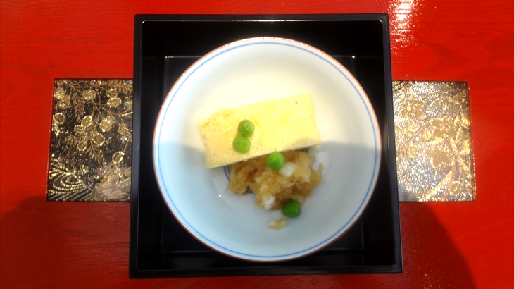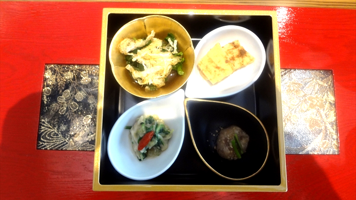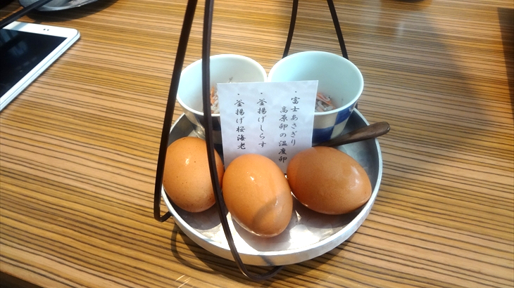 着席してすぐに豆乳とフルーツのスムージーのドリンク、しばらくして和朝食膳(2200円)が赤い下駄板に乗って出てきました。3段重のおかずとご飯、お味噌汁、香の物それから釜揚げしらす・桜海老・朝霧高原の温度玉子がカゴに乗せられてきました。