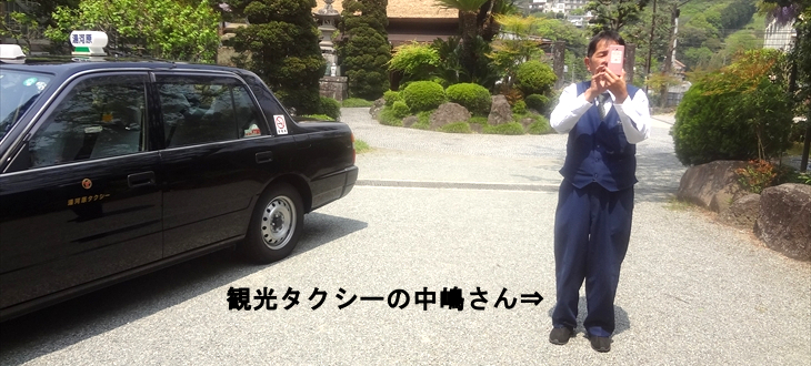 観光タクシーの運転手は中嶋さん、地元の方で数年間コージコーナで働いた経験がありタクシー歴32年のベテラン。とても親切で色々と湯河原のことを車内で説明してくれます。
