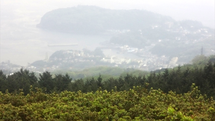 この公園は山の上にあり、ここから真鶴半島の全貌、伊豆半島など雄大な景色が楽しめるようです。あいにくの天気、薄らとしか見えません、雷で空もゴロゴロしてきたので早々にタクシーへ戻り、次の目的地、真鶴半島へ向かいました。