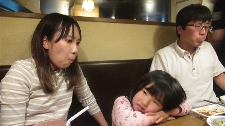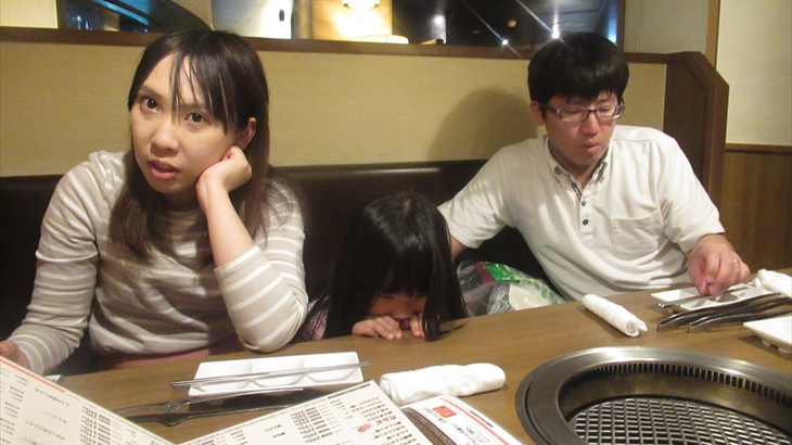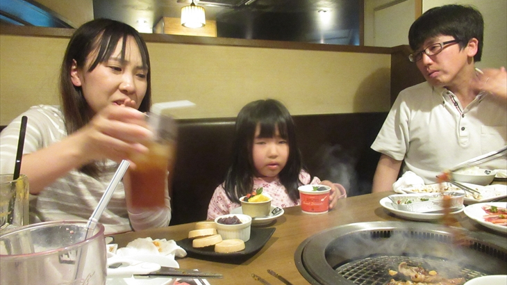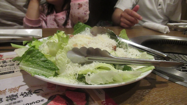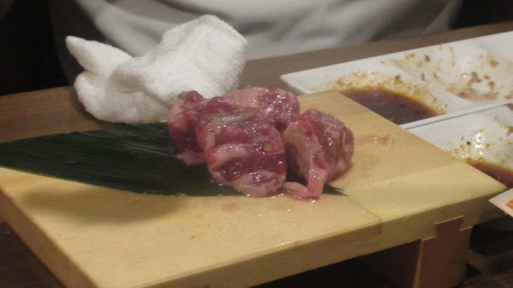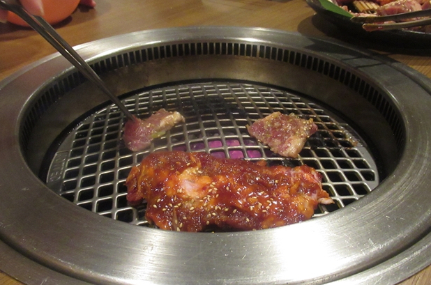 牛角カルビを焼きました。脂が多い割にはお肉は固くあまり美味しくありません。焼肉の煙吸引装置が各テーブルに設置されていないので店内は煙が充満し長女は涙目に・・・・