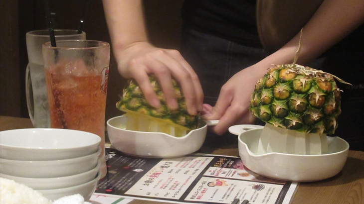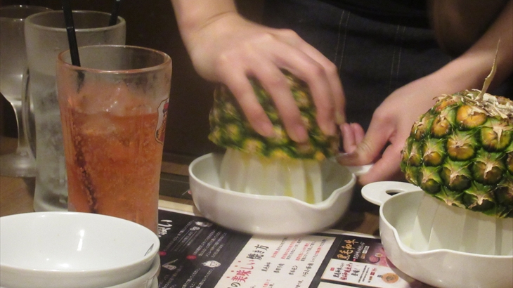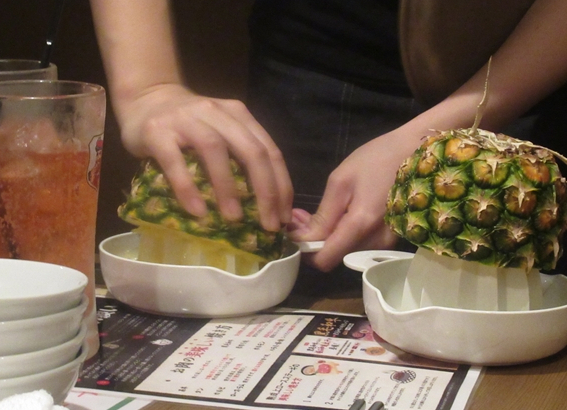 飲み放題メニューがあったのですが全員注文が必要、しかたないので私はワインボトル、子供達が注文したパイナップルサワーは半分にカットしたパイナップルを従業員の方が絞ってくれました。