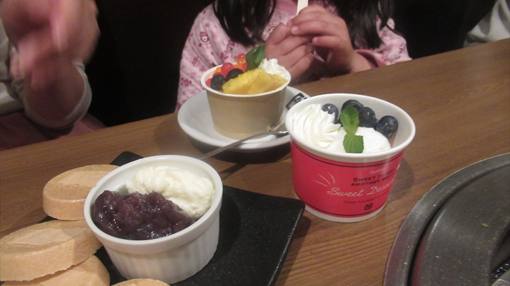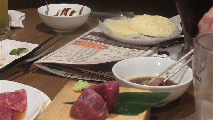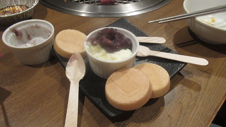 ロース、ハラミなどを追加注文しているうちに90分経過したらしくラストオーダの時間、デザートをお願いして牛角の食事会が終わりました。