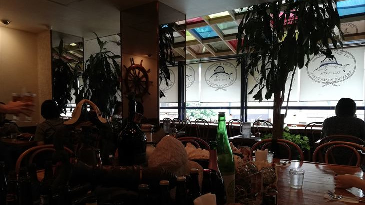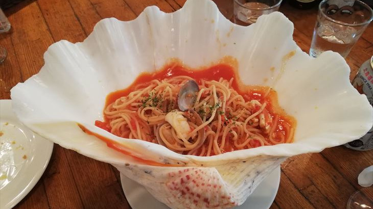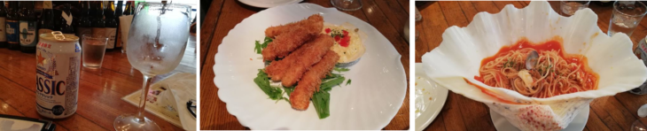 元町の1983年総合の老舗洋食屋さん「フィッシャーマンズワーフ」。14時に到着し、イカフライ、グラタン、スパゲッティを白ワインとともに頂きました。スパゲティは大きな貝、本物のシャコ貝に入れられビックリです。